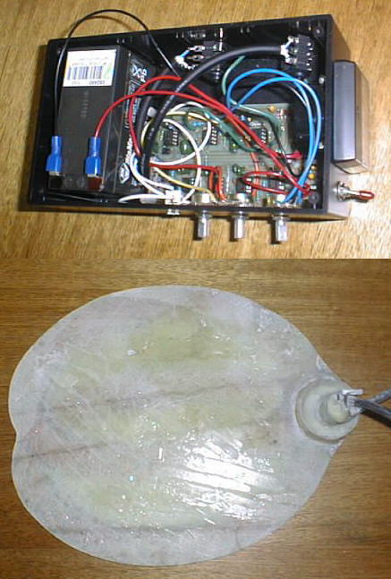 Adrian's Metal Detector"   in Kent, UK. Adrian built this detector himself using his own parts. He just bought the Circuit board from me. He used two 6 volt Gel cells in series to get 12 volts as it was Cheaper for him to do this. The Batterys are in a seperate box, Not shown. A Quote, One of his Comments: "Absolutely Bloody Marvellous little design!!, Not only boffo performance but idiot-proof too!! (and boy..... I've tested that aspect to its limit!!!) Adrian also made a very Favourable Comment on the performance of my flat coil design. but there was a lot of swearing as he tried to make it. However he is Very happy with the final results using it. He says, Quote: "I can clearly detect a "Bean Tin" sized aluminum light fitting at over 27 inches". Nice Nice Pictures Adrian.