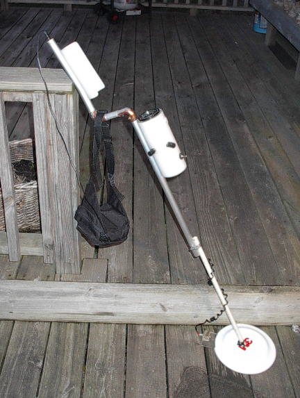 Dave's Metal Detector"   in Australia. Dave's Comments: Gary, Greetings... Attached are some pics of the finished detector. It is a beaut machine. Very happy with the results so far. No "treasure" found but plenty of trash and a few coins. This detector is more sensitive to small items than I thought it would be. Have found tiny fish hooks on the beach and will detect coins down to 8+ inches. I made some small mods like putting a bigger knob on the beep pot so I can use it as a thumb wheel for adjustments on the go. I also soldered the microphone cable directly to the coil and used a mic connection on the other end so I could run a ground connection to the shield of the wire and, if necessary, to a shield on the coil. It appears that no shielded is necessary. I used an old plastic plate as a coil bottom and just covered the top with plastic. The power supply is a small 12v battery I have on my waist to reduce weight. Excellant machine. Thanks Dave - Australia. Nice Work Dave, And THANKS for the PICTURES AND COMMENTS.........Happy Hunting Gary