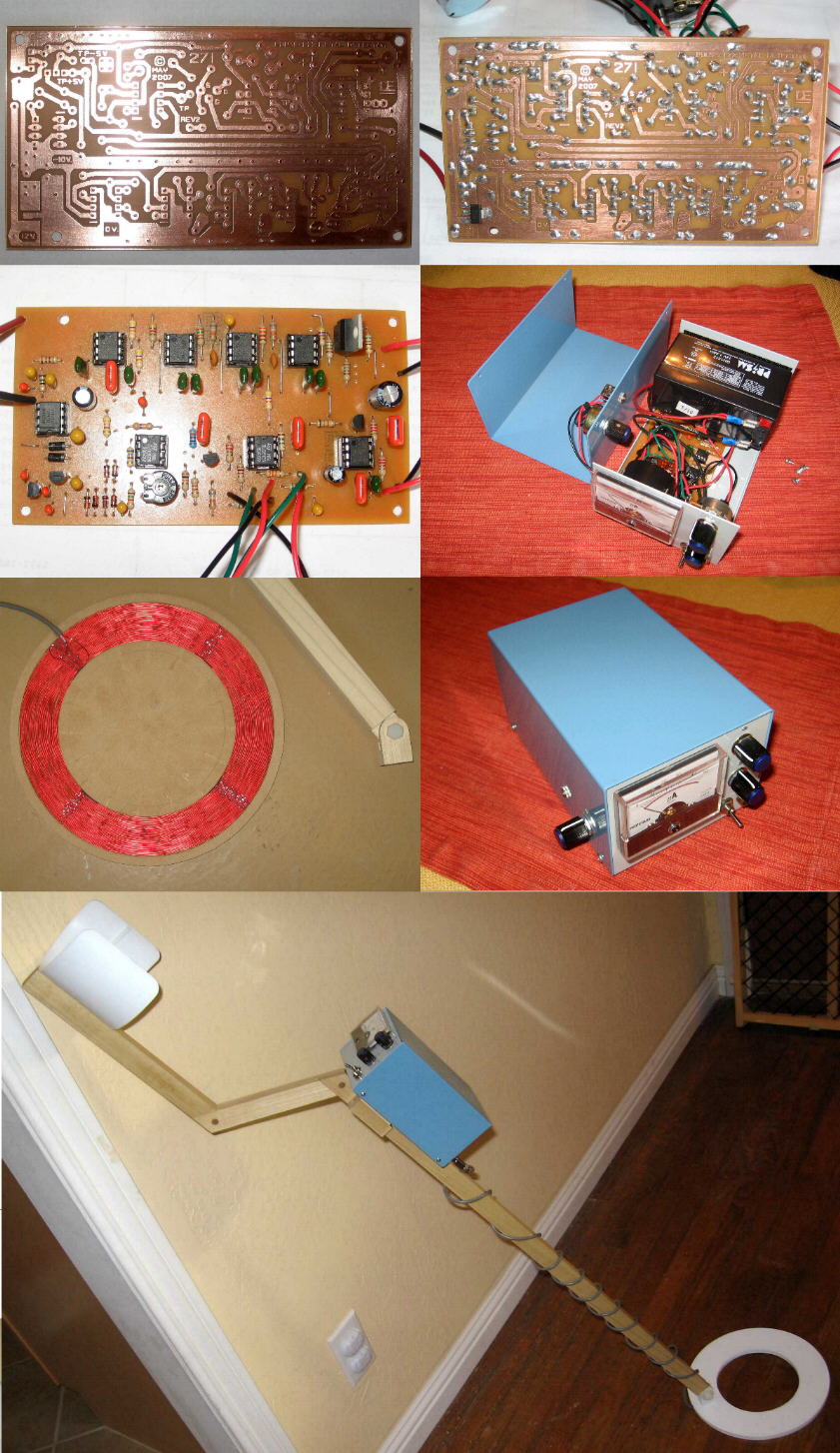 John's Metal Detector"   in Arizona, USA. John Bought the kit of parts and an 8" coil from me and says he can detect an Aluminum can at about 18 inches. He said he replaced the TL081's with AD711's. and got a slight improvement in sensitivity. ** I Also tried these AD711 IC's with somewhat Poorer Sensitivity than the TL081's. ** "Definately didn't justify the cost difference". He Also tried a Different fet for Q3, as he initally had poor sensitivity. Sometime Q3 can be a problem, But I Batch test all the 2N3819's, before using them in my kits so they should be good. Update: John has now purchase two 6" coils from me to try to detect Smaller Objects. One for my PI Detector and the other for a Commerical made detector. He was surprized as to how much more sensitive it now is to Smaller stuff. Thanks John, for the Revised pictures and other info.
