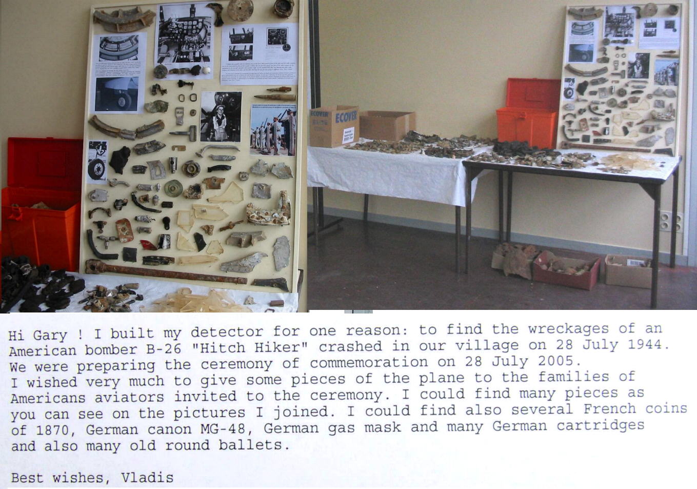 "Vladis Metal Detector"   in France. "And Items Vladis found" Vladis said he built this detector about 3 years ago, but just sent me this picture on "Mar 13, 2008". Vladis also created the Picture with his comments on it. By request, he than sent me a picture of the items he found. I posted these along with his email explaination of it all. Better late than never and It "ALL Looks Very Professional". THANKS Vladis!